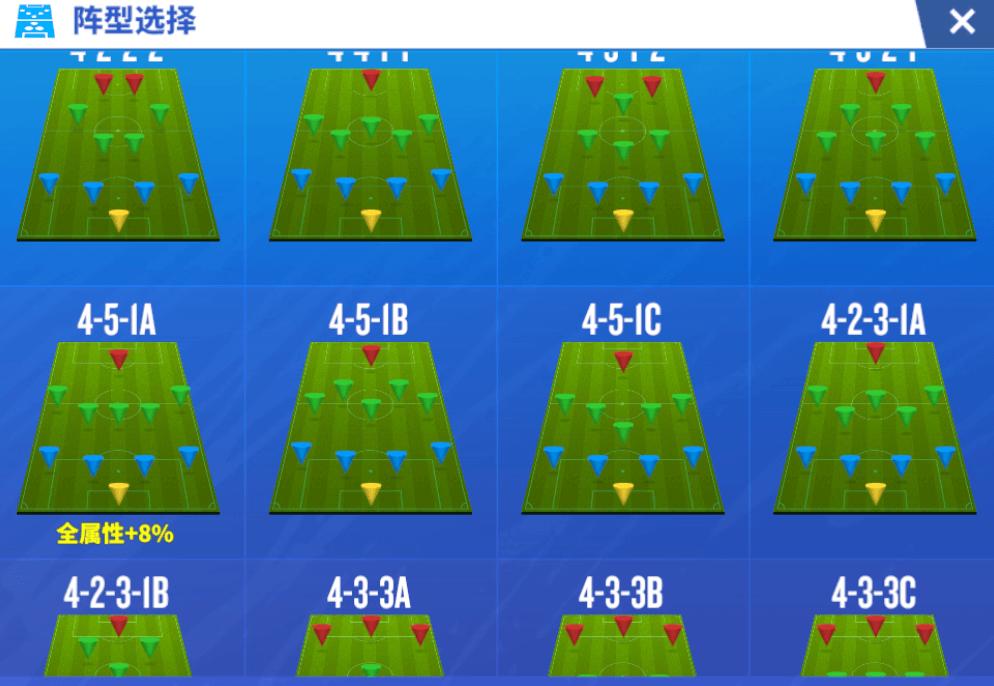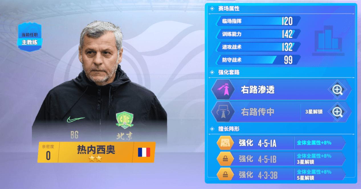热内西奥会给使用4-5-1A阵型的玩家提8%的战力提升(如下图),当热内西奥升至3星时会解锁强化4-5-1B阵型8%的战力提升,当热内西奥升至5星时会解锁强化4-3-3B阵型8%的战力提升,是前期提升战力的有效方法。
