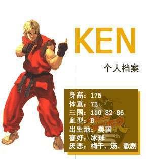美国的名门MASTERS家的少爷。在师父刚拳的指导下与隆共同学习空手道。有参加历史上参赛人数最多的格斗大会优胜的就经历。基本的格斗方式和隆相似。和硬派的隆不同的是他有个恋人依丽莎。虽然基本的格斗技能相似,但是由于性格和学习环境的差异和隆的技能有着细微的差别和性质上的区别,与强化波动拳的隆向对肯对升龙拳进行了强化并自创出能燃烧出火焰的升龙拳。他在其后还根据升龙拳研究出了两套自创超必杀。