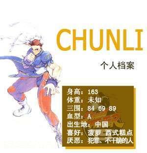 美丽漂亮的ICPO(国际刑警)特别调查员。为了在调查犯罪中失踪的父亲,以18岁的年龄进入了警界。经常为了失踪的父亲落泪。十分善良的她除了精通*拳术和格斗技能外还以第6位的成绩在国际警察射击大会上获奖。是个非常有实力的女性格斗家。她独立研究父亲传授的拳法,形成了独特的春丽格斗,其跳跃技能和掌气的运用是很得意的。
