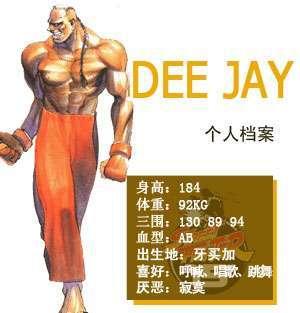 拥有褐色的皮肤和男人的气质在战斗中感觉攻击节奏。可以感觉新的音乐节奏的DJ。为了满足自己的音乐才能,融合格斗和因为两方面,实现自己远大的梦想到世界各地去旅行。他拥有独特节奏的轻巧的连续攻击。得意技是机武器连续勾拳。一旦完全命中对手将立即昏迷。此外带有对空属性的铲腿也是十分出色的攻击手段。是个不能让人大意的对手。