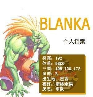 BLANKA本名吉米·福尔茨,热带雨林养育的孩子,长期封闭的生活使他丧失语言功能,毛发也发生了变化并且皮肤变成了绿色。作为生日礼物的镯子上的名字成为他唯一的记忆。在亚马逊的锻炼使他身体健壮,并且可以用身体飞出攻击,充满野性是布兰卡的攻击特色。
