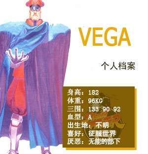 邪恶组织Shadowlaw的统治者,操作邪恶的精神力量的魔人。以前曾经是一个喜欢格斗的青年。由于心中的欲望太强烈而杀死了老师从而暴走。从此企图征服整个世界。以贩买毒品为中心,暗杀各国的权利者。并且与春丽父亲的失踪,T·HAWK父亲的死,CAMMY的被绑架以及洗脑等各种罪行都有牵连。拥有精神力量是VEGA强大的真正原因。他的行动已经脱离了人类的范畴。特别是精神力爆击这种究极的杀人技将许多知名的格斗家在瞬间埋葬。