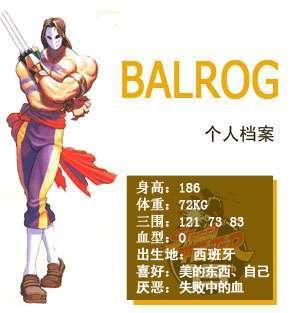 拥有令人惊异的爆发力的拳击手,Shadowlaw四天王。拥有天才的拳击素质,所有比赛都以击倒对手获胜。但由于比赛过程中对对手太过暴力而被拳击界禁赛。以后曾经做过酒店和赌场的保镖。由于VEGA许诺给他更多的报酬而成为VEGA侧近。而他内心中期待着有朝一日能打倒VEGA而成为老大。除了下段拳和头突外几乎所有招数都是正前方拳击突进技。拥有无法想象的迅猛爆发力和速度。拥有令人瞬间窒息的破坏力才是他的真正价值。