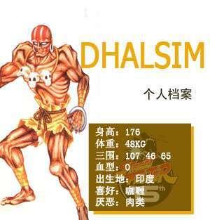 逾迦术的奥义在于减少自身脂肪,使骨骼可以伸缩自如。Dhalsim就是逾迦术的高手。拥有美丽妻子萨丽与儿子达达的他为了解救村人而不断进行战斗。刻苦修炼的结果就是Dhalsim拥有伸缩自如的手足。此外为了不给对手造成严重的损伤,Dhalsim使用了一种伪火焰进行攻击。目的是使对手知难而退。不伤害别人始终是他战斗的信条。
