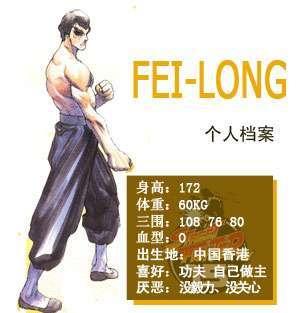 在香港出生的人气电影明星。16岁时就拥有非常出色的身手。一举成为出色的动作片明星。此后尽管退出了影视界但他的武术流派飞天流功夫仍然吸引了无数爱好者。在全世界约有300万弟子。飞天流功夫是一种集力量与速度完美结合的格斗流派。一旦把握机会就会发动令对手防不胜防的攻击。而且在使用必杀技时会发出“咳哈”的独特声音。