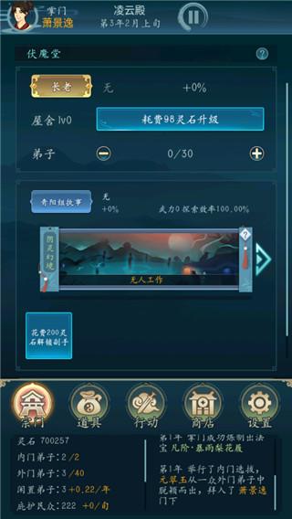 不做赘述,外门弟子推荐优先升级挖矿,其次采药,护山阵有资源就正常升级。重点說撰写功法,这个功法用处非常大。掌门和门内弟子每升- -个大段可以撰写功法,功法的作用是加成弟子的属性。举个例子,掌门人或某个弟子撰写了雷诀卷篇壹,该功法的效果是修炼率加成23%,要求必须有雷灵根必须是元婴,那么你门]内所有有雷灵根的弟子,当他修炼到元婴级别时,其修炼率就会有23%的加成。因此,一定要把所有的功法都写完,这样会大幅度提升你的修仙进程,甚至能让你三灵根的笨蛋弟子实现飞升。