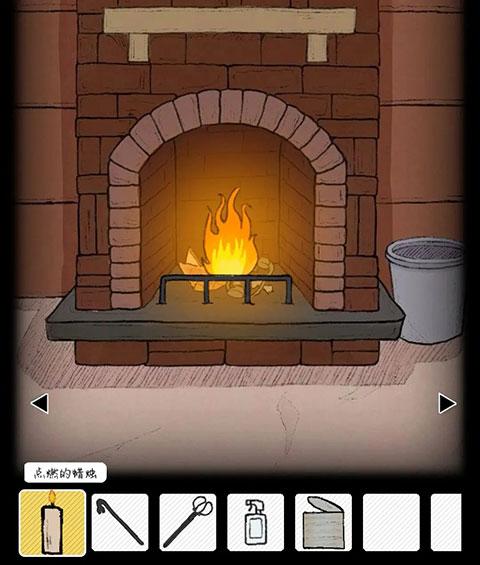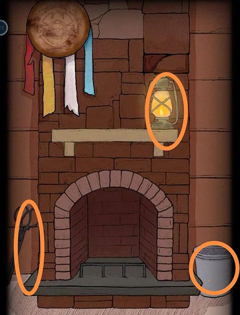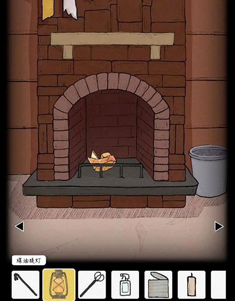2、壁炉上方有提灯;左侧有火钳;右侧桶里是空罐头。
