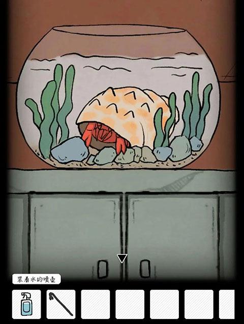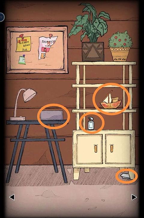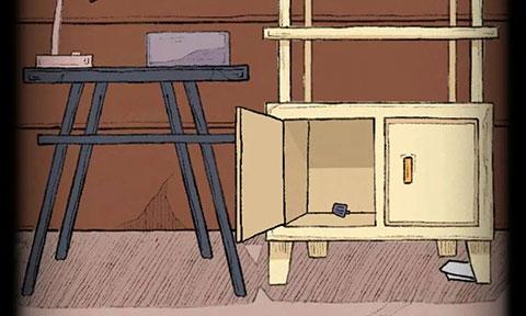 8、把上图的旋钮放在台灯旁边的盒子上。并收集木雕船和空的喷壶;查看柜子下压着的纸条。