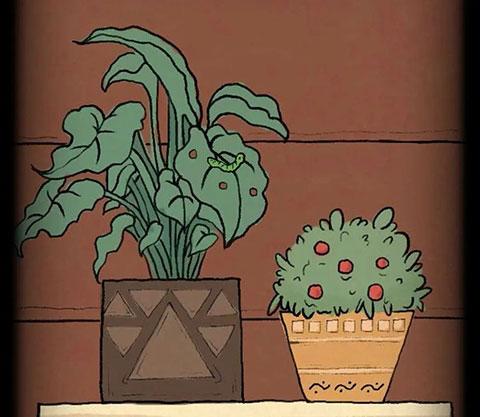 6、根据旁边两个盆栽上四个图案,得到下方柜子左侧门四个密码数字8783。