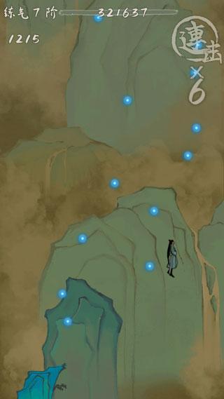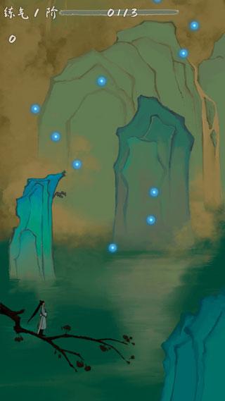 3、点击手机屏幕两侧,控制游戏角色左右横移,捕捉灵气团(蓝色光点)、捕捉各种功法,躲避障碍怪物,使游戏角色不断上升,获得一定灵气量突破至下一境界。
