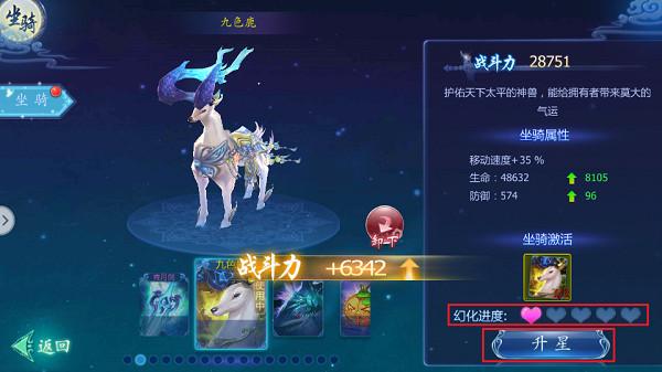 当我们拥有坐骑后便能使用相同的【坐骑卡】继续对坐骑进行升星啦,升星后能大福提高坐骑属性以及提升战斗力。升至一星需要1个,依此类推升至五星则需要5个,每个坐骑最高可以升至五星!在坐骑属性中的左侧白色文字显示的是当前的属性数值,右侧显示为下一星能增加属性数值。