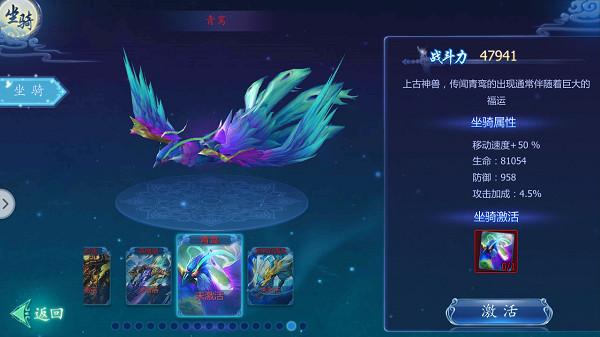 上古神兽,传闻青鸾的出现通常伴随着巨大的福运。移动速度+50%,生命+81054,防御+958,攻击加成4.5%。可在【限时活动】中获取。