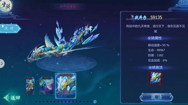 传说中的九天神龙,龙行天下,身形见首不见尾。移动速度+50%,生命+99967,防御+1182,攻击加成6%。可在【飞升寻宝】活动中获取。