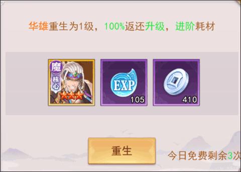接下来,先选择一个输出类型的五星武将升级进阶,推图闯关更快,也可以尝试多种类型的武将,毕竟重生武将可以百分百返还资源,可以按照自己的理解无成本尝试。