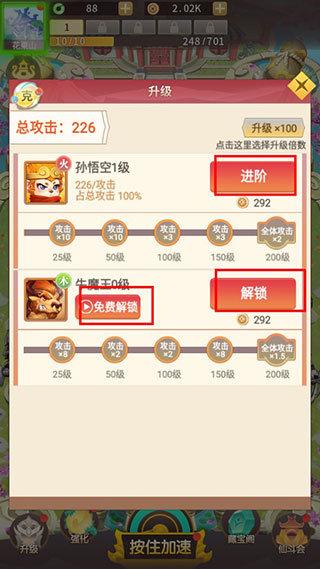 在游戏中你只需要点击屏幕就可以打败各种怪物,你也可以解锁更多的英雄来帮助你一起战斗但是英雄会自动战斗,战斗的怪物会得到黄金。
