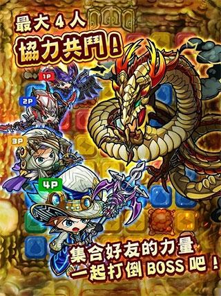5、【齐心协力 打倒强敌】 游戏支援最大4人连线合作,玩家可以邀请身边的朋友一起挑战合作专用关卡,通过队 友所在方块时队友会一起参与攻击,合力打倒魔物领取限定奖励吧。