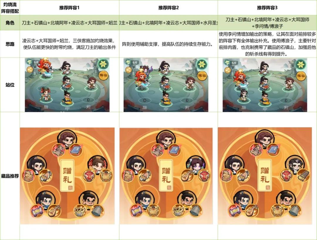目前灼烧流阵容的核心侠客是凌云志,他施加的灼烧出众,且可以获得大量减伤加成,持续伤害的层数叠加,让刀队整体打伤害的能力非常强劲。侠客的站位除了凌云志想要在第二排,北境阿年和大耳国师可根据对方的站位合理调整一二排哦~