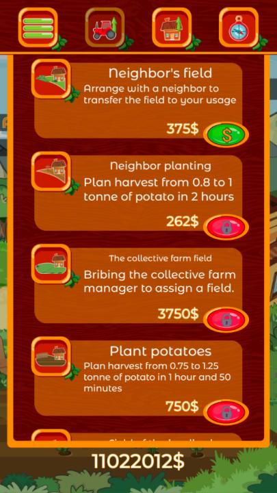 3、玩家通过购买土地和种植土豆,根据市场需求调整土豆价格,调节土豆品质最终争取在市场上获取最高的收益。