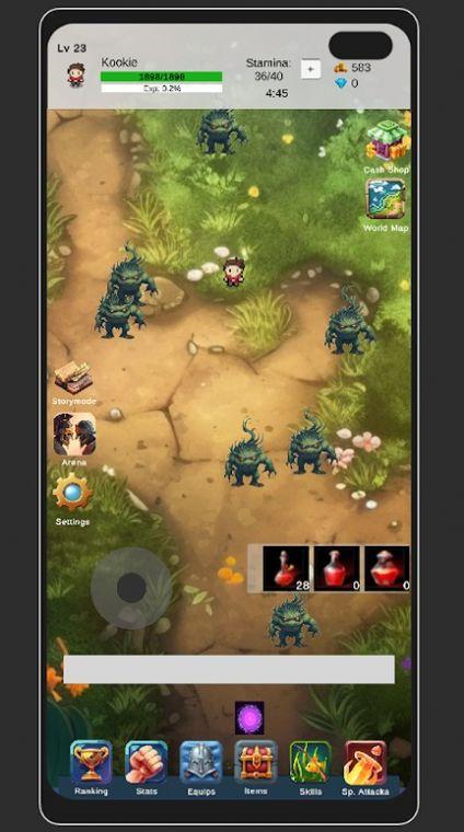 1. 使用虚拟按钮控制勇者移动、攻击、释放技能,应对各种敌人和场景挑战;