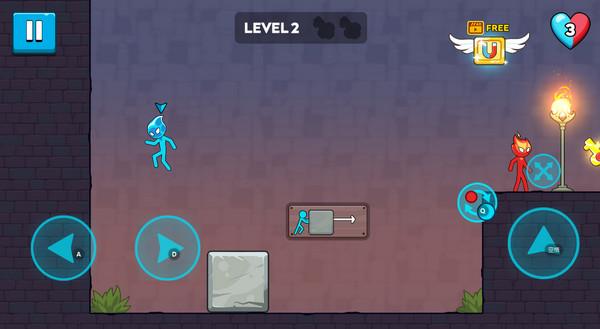 控制与液体同色的角色推动石块,在液体中铺路,让另一个冰火人通过。