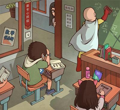 2、穿蓝色衣服的男生,书本里夹着一本漫画书,点击漫画书就可以了。
