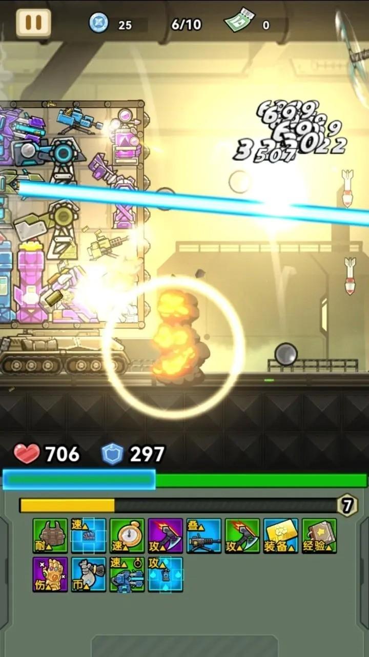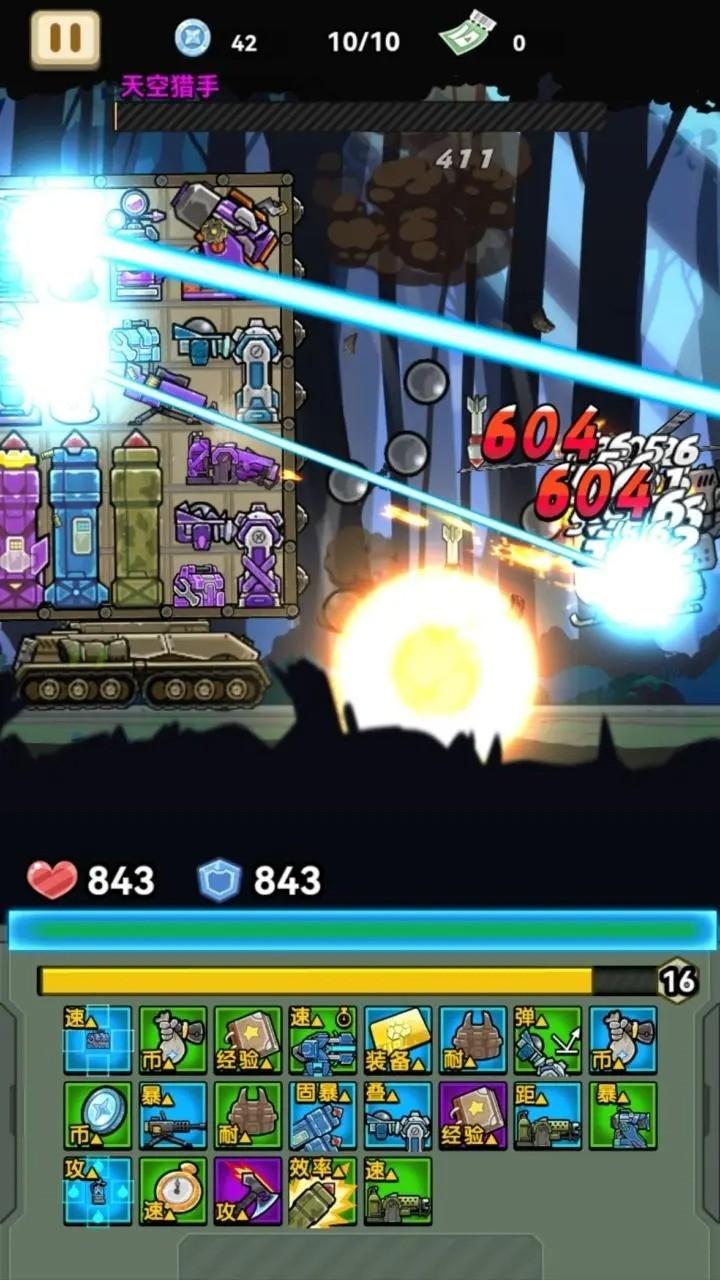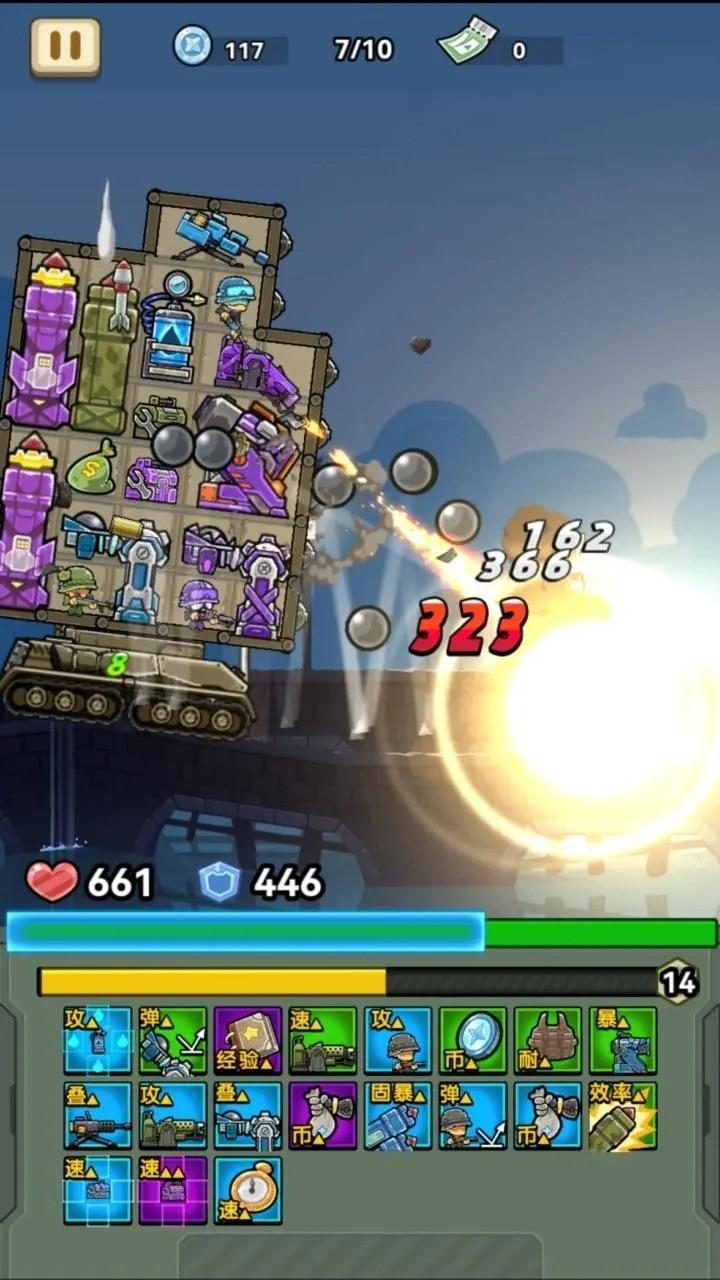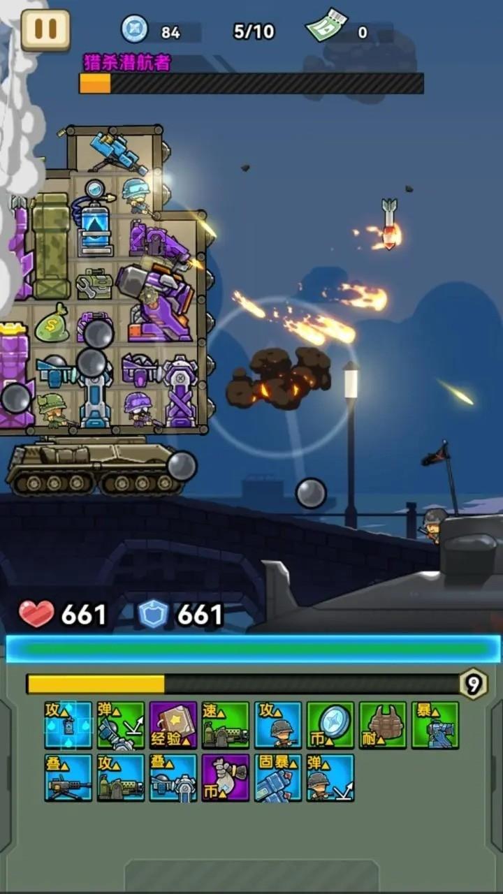 战车向前冲向敌人开炮拥有丰富的关卡。游戏开始时,玩家将获得一辆坦克,放置武器和士兵,并做好战斗准备。当两个相同的道具放在一起时,就会合成出更强大的道具。防御塔会自行攻击敌人。每波结束后,玩家可以休息并再次获得网格和装备。