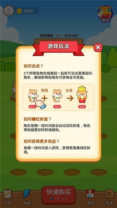 4. 合成升级:收集相同品种的小狗进行合成,提升狗狗的等级和品质,解锁更多新品种。