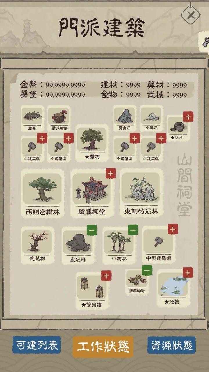 在山门里建造各式各样的建筑,他们将会解锁各种功能和加成。