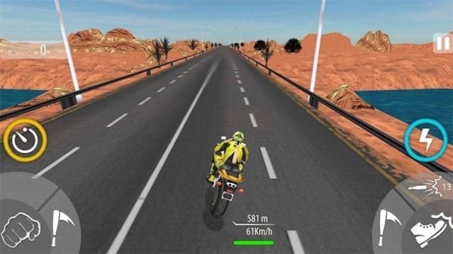 公路摩托真实模拟3D是一款摩托驾驶竞速游戏。在这款崇尚以打斗和暴力延迟对手以取得领先地位的摩托游戏中,游戏的主旨不是竞速,而是在高速的行驶中打翻或踹倒对手的摩托,感兴趣的玩家快来下载游戏体验吧。