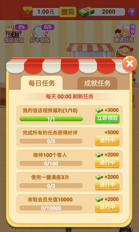 累积完成一定数量的任务,对你的饭店进行升级,每次升级都能获得红包,等级越高红包越多。