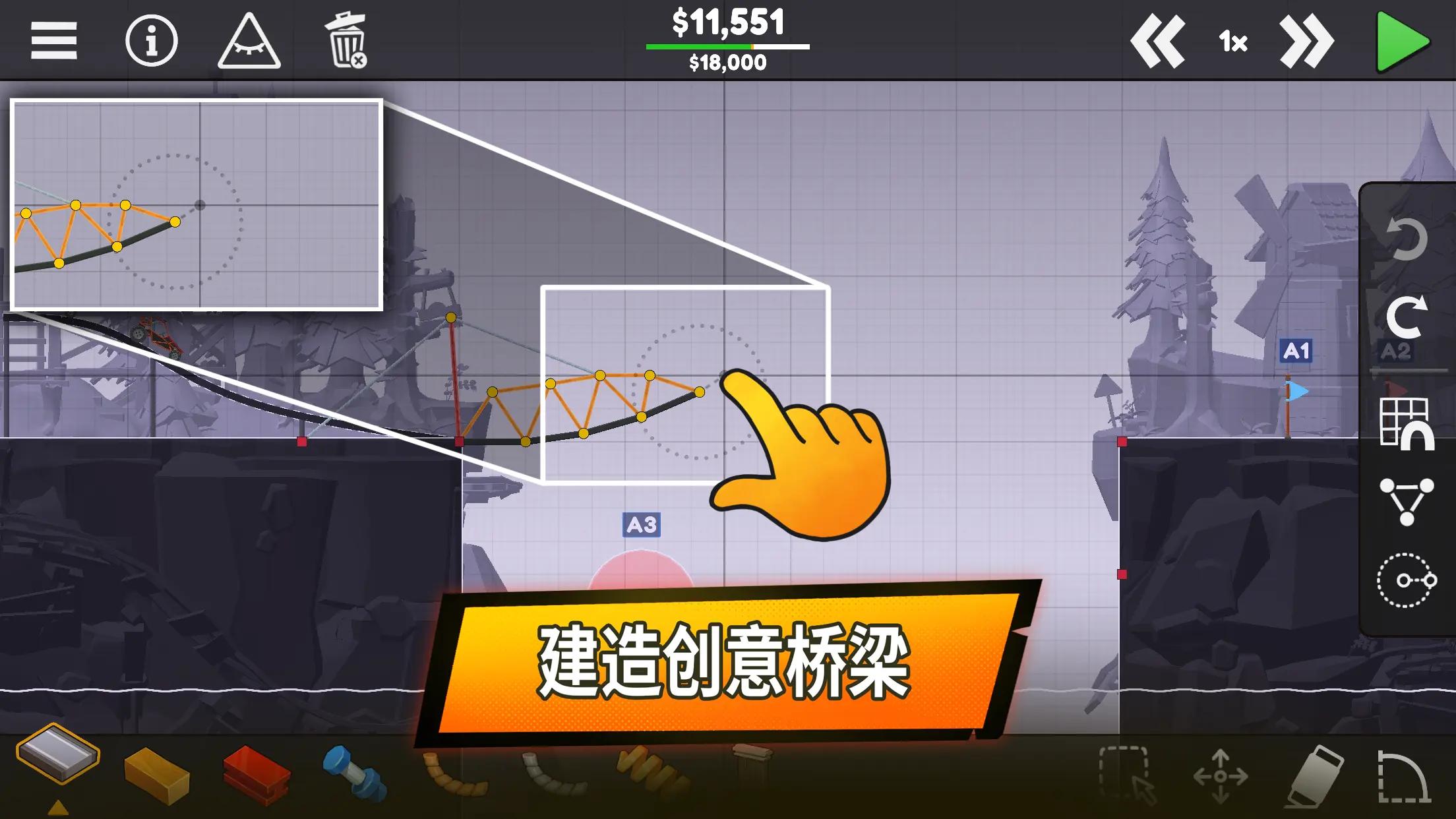 3、在沙盒模式中释放您的工程创造力并将您的桥梁建造技能发挥到极限。