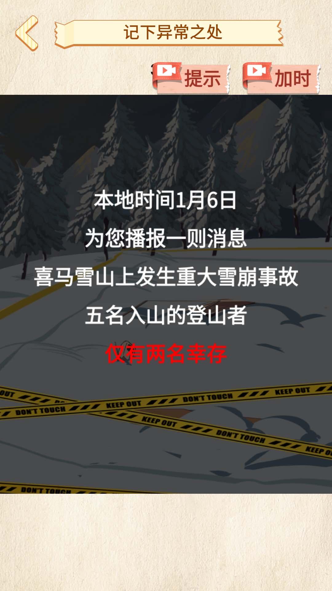 休闲的小游戏,伙伴一起在雪山合影。惊悚好玩火眼金睛找出疑似点,请找出照片疑似之处成功找出相关数量则游戏获胜。快来加入我们吧