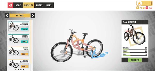 6、而收集起来的金币可以在商城中购买新的自行车,不同的自行车他的速度等属性也会不一样