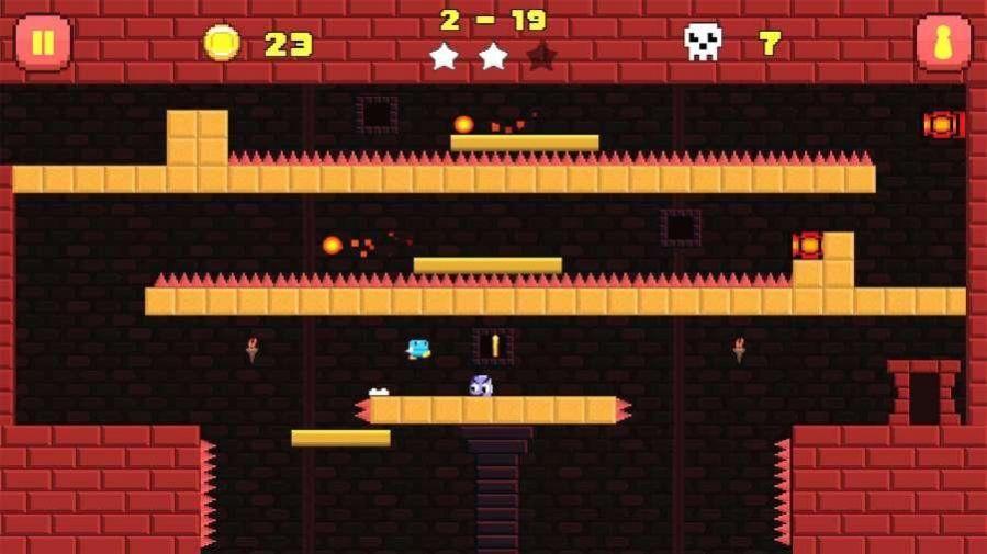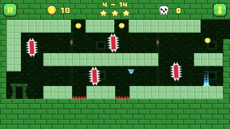 游戏采用经典的像素风格,玩家操控主角的像素世界里闯关冒险,点击左侧停止,右侧跳跃,越过障碍物和陷阱,过程中要记得收集金币,收集的越多就能获得三星。