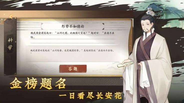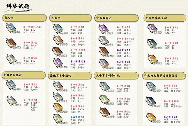 每年3月京城-皇城举行科举,入榜即可入官。试题都需要四书五经作引论,不然必落榜,所以未有官职前,行动点数都花去太学拿书。目前测出来,基本甲级不变,但名次会有变动,所以中状元也看脸。