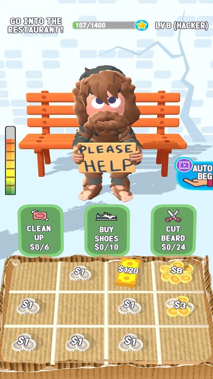 作为一个无家可归的乞丐,你可能很难让别人喜欢你,但你可以通过乞讨来的钱改变你的衣服和外衣来变得富有并被接受。求填饱肚子子,买房买车,尽情享受吧!当你求时,升级并更有效率地求!