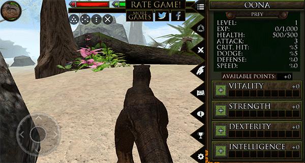 2、点击左上角的恐龙图像可以开启更多界面,如下图所示,玩家可以查看自己的等级,经验!右下方是生命值、力量、敏捷的属性,玩家还可以点击地图标志来查看自己的位置。