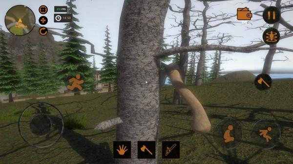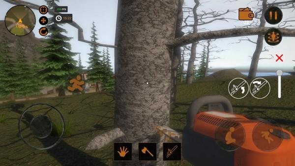 2、进入游戏后点击左侧的轮盘可以操控角色进行移动,下面的斧子按钮可以取出进行砍伐;