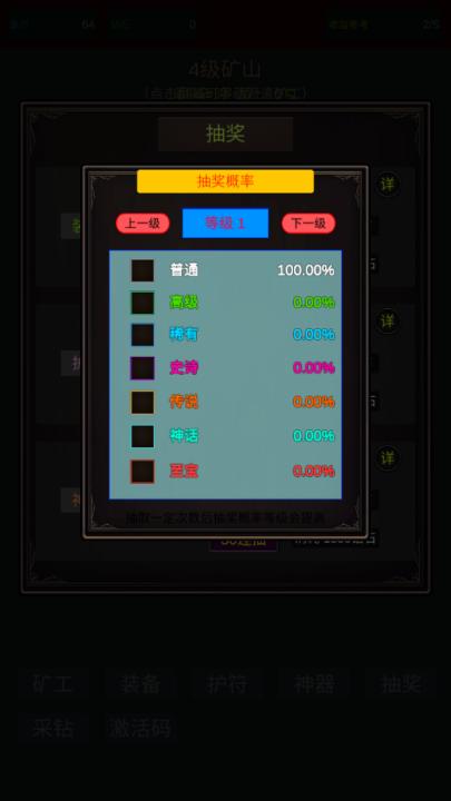 装备和护符都可以消耗钻石批量抽奖获得,养成形式很接近某些纯数值向放置类游戏,有品质设定,可以批量升级。每一种矿工可以选择佩戴一样装备,而护符有单独的装备槽位,1000级解锁第六个槽位,有一些组合搭配空间。