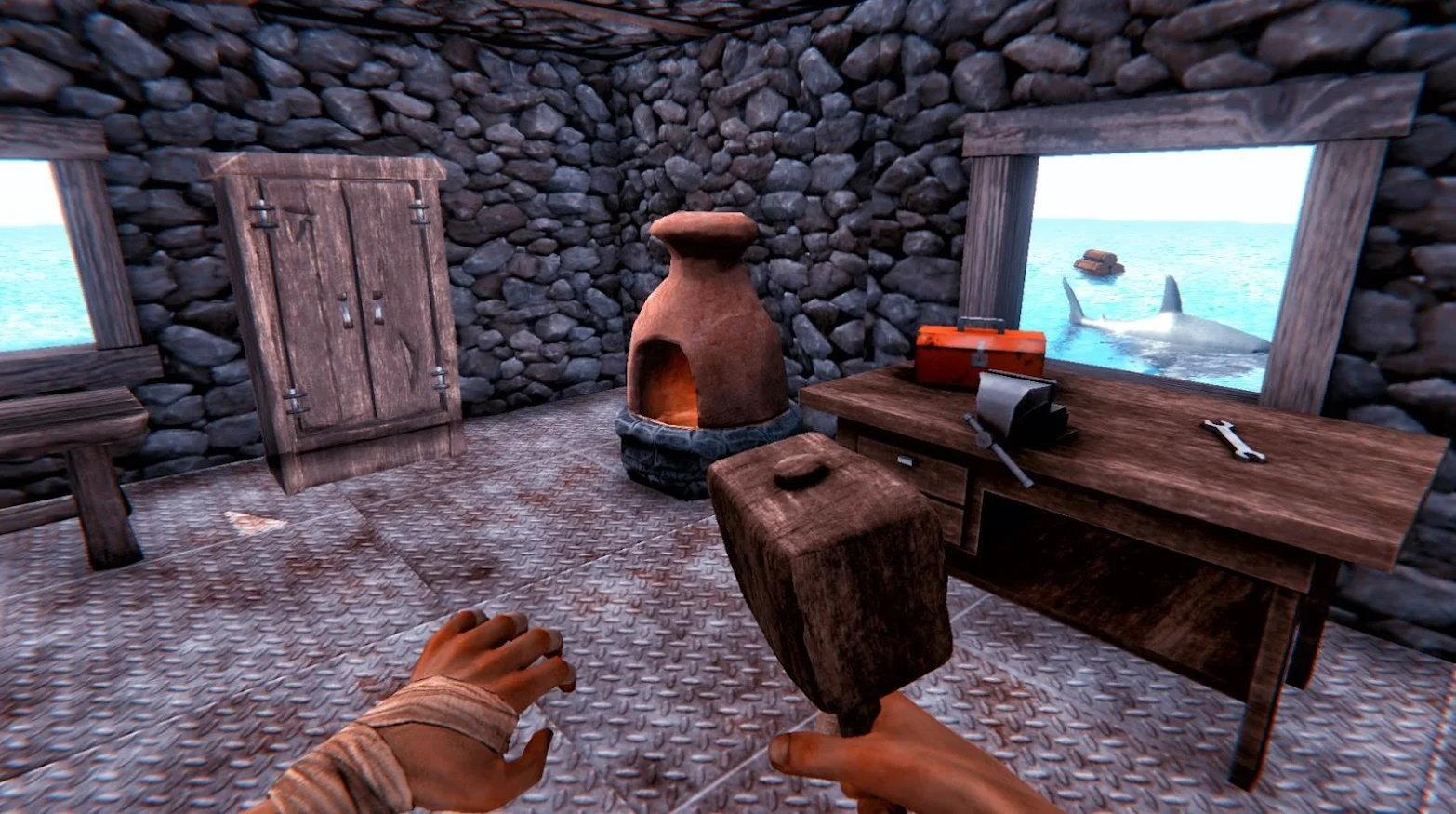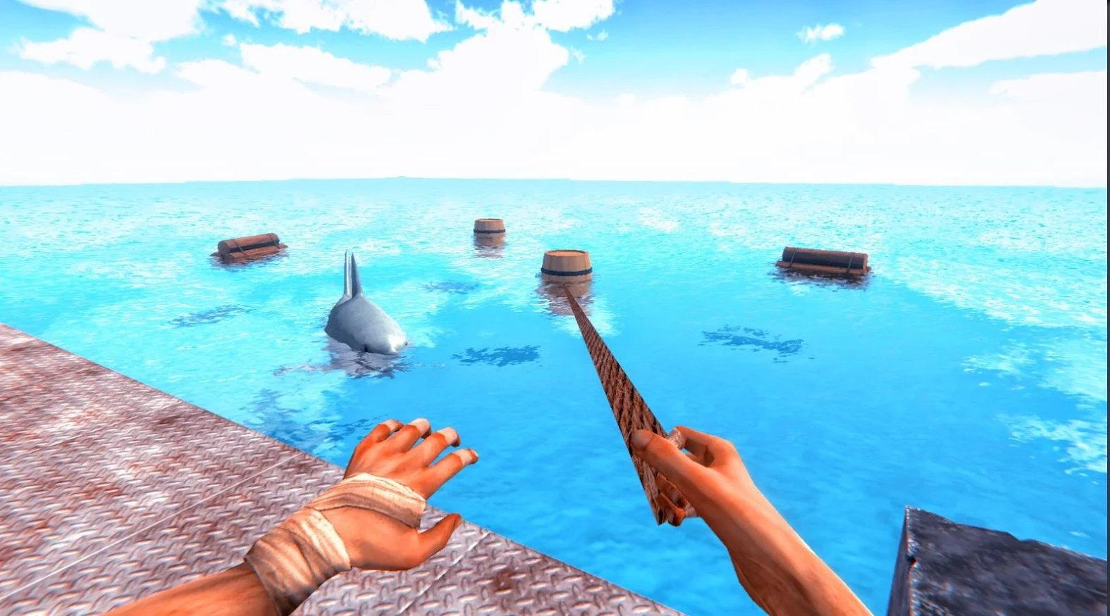 3、利用钩子勾住海洋上漂流的东西,利用这些物资制作有用的工具、,来加固自己的木筏并生存下去。