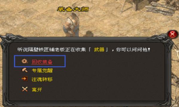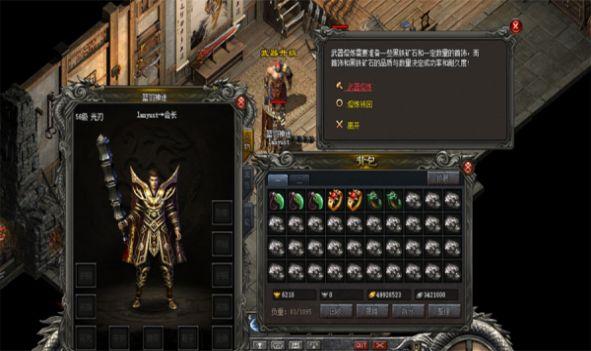 2、包裹里带上黑铁矿石和首饰,穿戴上要升级的武器。前往神歌城武器店( 576, 309)找“武器升级”NPC。