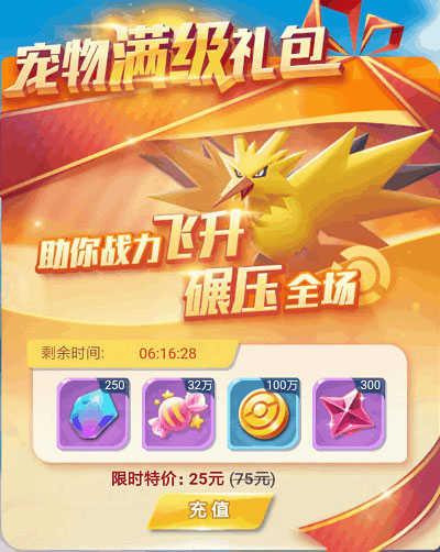 各种临时触发的限时幸运礼包,看具体需求购买。例如下图中的宠物满级礼包,从25元到168元档次都有,购买礼包可以获得钻石和大量升级材料,可以大幅度减少挂机时间。