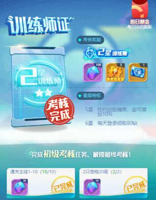 8个星级的训练师证,每完成一个星级,就要挑战相应等级的考官,挑战成功就能进入下个星级了哦!挑战星级官是可以获得坐骑升级石,钻石,和对应星级的称号激活卡。挑战竞技场也是优秀训练师的证明哦!