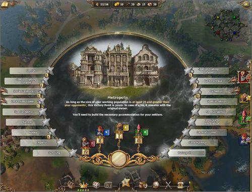 星数是你获胜的最快途径,威望等级、工人数量、军队数量、金币数量、占领据点数量、研究科技的数量等等都可以让你领先其他玩家。而图中一些上锁的科技则代表其唯一性,有龙头的星数建议大家不用太多关注,因为所需要的物资数量是非常惊人的,至少我从没靠这个来获取星数。其他上锁的科技如第一个建造修道院、获得科技星、占领星据点等等。所以在闷头发展的同时千万别忘了多关注下对手的星数情况,以免自己落后太多。而一旦达到地图所需的获胜星数,就将进入3分钟倒计时,时间一到你就成为最终的赢家。