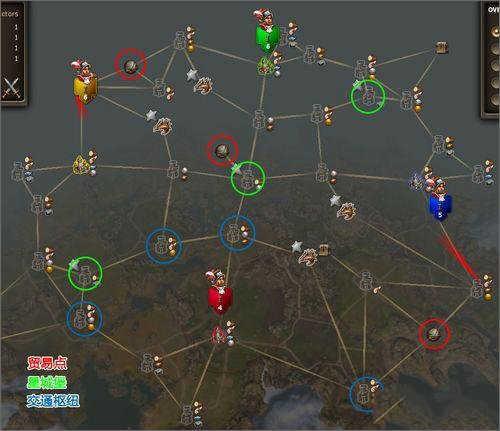红色为贸易点,很显然属于共享型的贸易点,无法控制。所以一定要尽早占领附近据点,开通你需要的贸易路线,否则别人开通了你就无法使用。