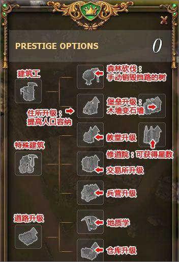 威望点数的使用:特殊建筑->建筑工->住所升级->堡垒升级->道路升级->仓库升级->教堂升级->兵营升级->地质学->修道院->交易所升级