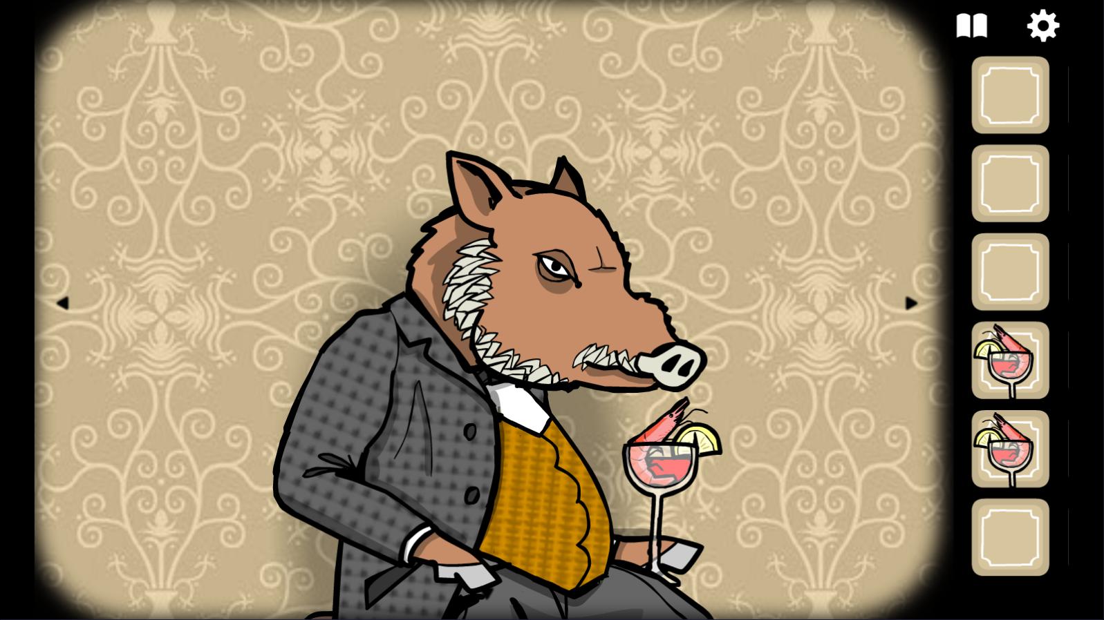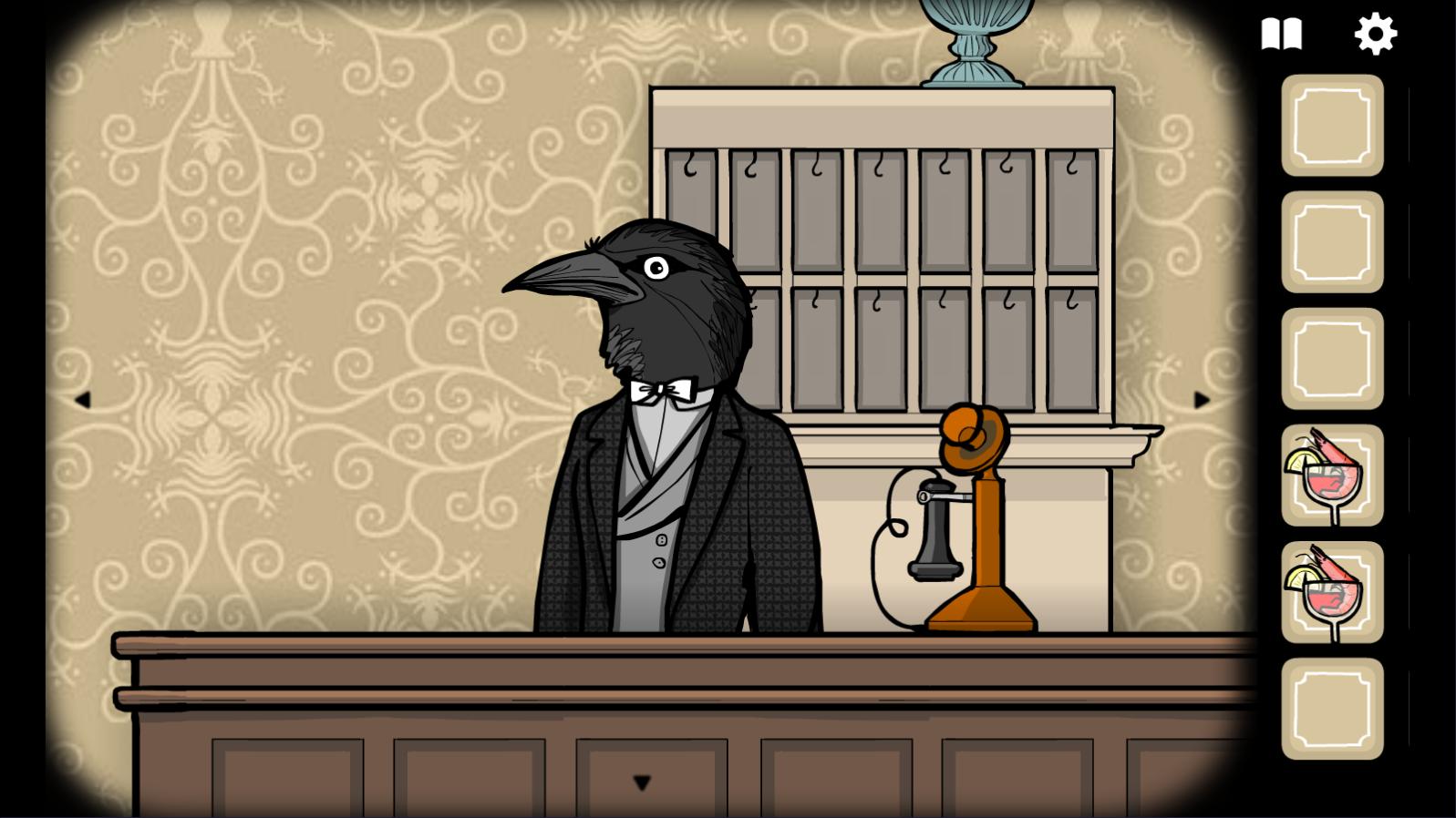 3、首先进入到前台,边上的门去往厨房。前台的五杯“鲜虾鸡尾酒”拿走(这丧心病狂的口味……)。点击乌鸦先生的时候他会说:“欢迎客人们的到来,周到体贴地为他们进行服务。”