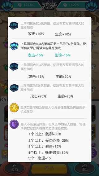 首先要介绍的是以花色划分的阵营。细心的同学们一定注意到了,英雄好汉们都有属于自己的卡牌花色,黑桃代表春,红桃代表夏,梅花代表秋,方片代表冬,此外还有王牌和恶人代表昼夜。每上阵同花色的一定数量英雄,就会激活羁绊,比如最简单的,上阵同花色的3名英雄,可以使所有友军获得攻击和生命均+10%的buff,以此类推,最高可加到25%,其中,王牌英雄可视为除恶人以外的任意花色凑羁绊的补充。恶人不会凑成羁绊,但上阵的恶人数会分别对应五档强力的队伍加成。