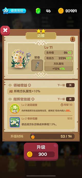 领袖增益:所有方队属性+10%领袖增益会在指挥官达到第10、20、30、40和50级时增加。指挥官技能:迷花绽放:向所有敌军方队投放寄生花,使其在7回合内陷入混乱。奇妙花圃:使近战方队召唤成本降低7.5%。适合模式迈雅的主动技能并没有直接伤害的效果,而且是让对手互相攻击。不过这个攻击的过程中敌军还是会向前行进。被动技能是降低近战方队的成本。如果是萌新开局没有光波法师的时候,还是不错的。不过后期我们用近战方队比较少,所以被动效果基本用不到了。