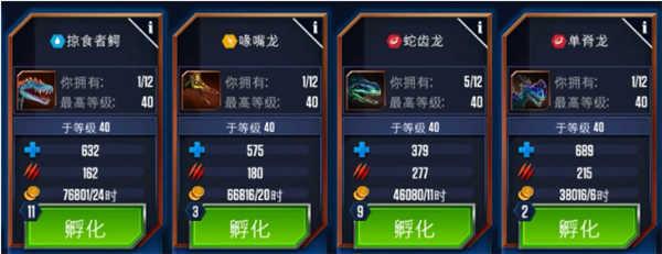 4、孵化所:每一只恐龙的诞生都必须经历一个孵化过程,游戏为玩家免费提供了一个免费孵化器,玩家花费现金可解锁更多孵化器,更快培育恐龙。